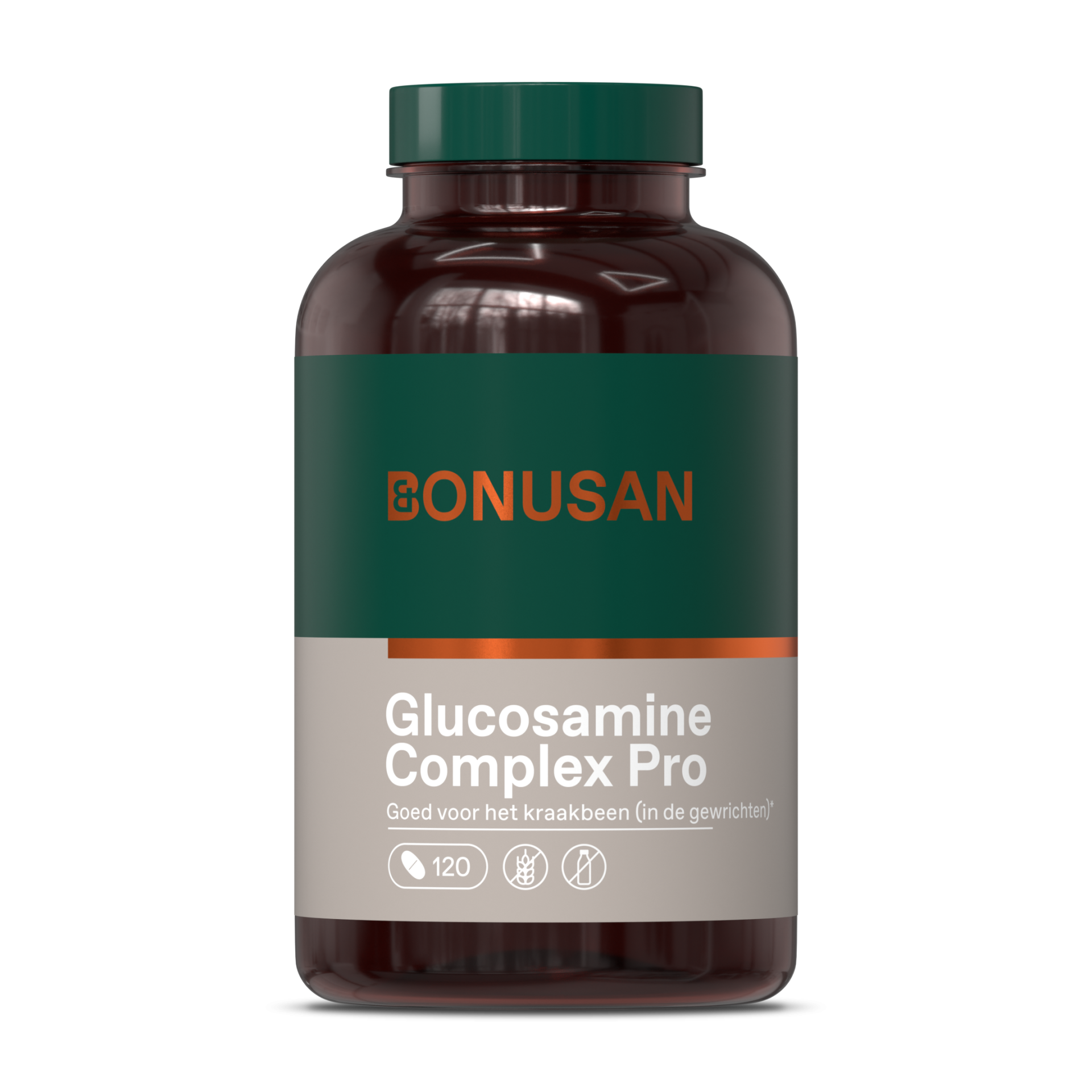 De voordelen van Bonusan Glucosamine PlusBonusan Glucosamine Plus is zeer zorgvuldig samengesteld. Het verenigt de juiste bouwstenen en actieve componenten. Naast de hoge dosering glucosamine zijn verschillende ingrediënten toegevoegd die zorgen voor een synergistische werking. Bonusan Glucosamine Plus bevat zink, mangaan en koper. Met dit product biedt Bonusan een complete formule waar ook zwavel (MSM), chondroïtinesulfaat in sterk gezuiverde vorm (90%), Tanacetum parthenium (moederkruid) en Equisetum arvense (heermoes) aan toe zijn gevoegd. Tanacetum parthenium is een waardevolle toevoeging omdat het bijdraagt aan de bescherming van cellen tegen oxidatieve schade*. Equisetum arvense draagt bij tot de instandhouding van normale botten*. Synergie wordt gecreëerd doordat Bonusan Glucosamine Plus zink en mangaan bevat, beide dragen bij aan de instandhouding van sterke botten. Zink draagt bovendien bij aan de aanmaak van cellen en weefsels en mangaan is goed voor de aanmaak van kraakbeen in de gewrichten. Daarnaast bevat dit product koper, dat bijdraagt aan de instandhouding van normale bindweefsels. Wij adviseren dagelijks vier tabletten tijdens of vlak na de maaltijd in te nemen. Een gezondheidsprofessional adviseert mogelijk andere doseringen gebaseerd op uw persoonlijke situatie.*Gezondheidsclaims in afwachting van Europese toelatingHoge kwaliteit dankzij specifieke samenstelling en grondstoffenBonusan Glucosamine Plus bevat chondroïtinesulfaat in sterk gezuiverde vorm (90%) en de belangrijke mineralen zink (zinkmethionine) en mangaan (mangaancitraat) in organische vorm voor een goede opneembaarheid. De glucosaminesulfaat is afkomstig uit natuurlijke garnalenschalen. Het meeste onderzoek naar glucosamine is uitgevoerd met D-glucosaminesulfaat, de vorm die we ook in dit supplement verwerken. Glucosaminesulfaat wordt zeer goed geabsorbeerd (90-98%) via een actief transportmechanisme. Bonusan Glucosamine Plus bevat Tanacetum parthenium extract dat gestandaardiseerd is op 0,8% parthenoliden en Equisetum arvense dat gestandaardiseerd is op minimaal 7% silica. Het standaardiseren heeft als voordeel dat er een gegarandeerde hoeveelheid van het actieve bestanddeel van de plant aanwezig is, waarvan uit wetenschappelijk onderzoek is gebleken dat deze een bepaald gezondheidseffect heeft. Factoren zoals groeiomstandigheden, grondkwaliteit, oogstmoment en het bewerkingsproces van de plant hebben dan dus geen invloed op de werkzaamheid van het product.Geschikt voor de instandhouding van soepel bindweefsel en de opbouw van kraakbeen in de gewrichtenBonusan Glucosamine Plus wordt in de praktijk vooral veel gebruikt door mensen die het kraakbeen en soepel bindweefsel in stand willen houden (dankzij koper). Daarnaast is dit product dankzij mangaan goed voor de aanmaak van kraakbeen in de gewrichten en helpt zink bij het behoud van sterke botten. De behoefte hieraan speelt vooral in een