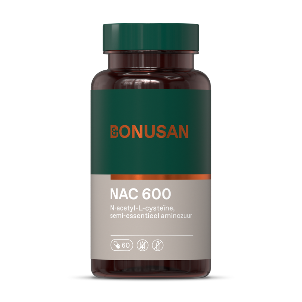 De uitgebreide kwaliteitscontroles bij Bonusan zijn een garantie voor de hoge kwaliteit en zuiverheid van dit product. Betrouwbaarheid is voor ons belangrijk, Bonusan gebruikt daarom uitsluitend de beste kwaliteit grondstoffen en uitgebalanceerde samenstellingen voor haar gezondheidsproductenGebruikDagelijks 1 tot 2 capsules tenminste een half uur voor de maaltijd innemen. De capsules niet innemen met eiwithoudende levensmiddelen. NAC wordt meestal gebruikt in een dosering tussen 200 en 1200 mg per dag, verspreid over de dag ingenomen. Misselijkheid en/of maagirritatie kan voorkomen als NAC op een lege maag wordt ingenomen. Het innemen van NAC met een licht verteerbare snack zonder eiwit (b.v. fruit) lost dit probleem vaak op.Samenstelling•Vegetarische capsule•Bevat de optimale vorm van het aminozuurSamenstelling per capsuleInhoud%RI*N-acetyl-L-cystei ̈ne (NAC)600 mg* Referentie-Inname IngrediëntenNAC 600 mg