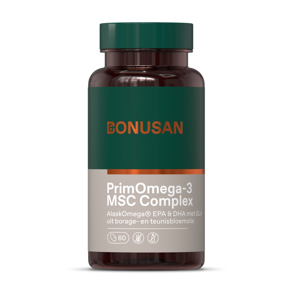 De voordelen van Bonusan PrimOmega-3 MSC Bonusan PrimOmega-3 MSC biedt een combinatie van EPA, DHA en GLA vetzuren. Onze gammalinoleenzuur (GLA) wordt gewonnen uit borageolie en teunisbloemolie. De speciaal ontwikkelde softgels van de Bonusan PrimOmega-3 MSC wordt gemaakt van visgelatine en is dus vrij van runder- en varkensgelatine. De softgels zijn ook nog eens makkelijk slikbaar en vrij van geur en smaak. Hoge kwaliteit dankzij MSC visolie en plantaardige olie Bonusan maakt voor haar omega-3 supplementen gebruik van gezuiverde en gefilterde visolie. Dat betekent dat het gehalte aan eventuele contaminanten (zware metalen, dioxines en PCB’s) erg laag is, conform de norm van de Europese regelgeving. Voor de PrimOmega-3 MSC softgels gebruiken we op duurzame wijze verkregen visolie die is gemaakt van 100% Alaska koolvisolie. De koolvis in dit product komt uit een visserij die onafhankelijk gecertificeerd is volgens de MSC standaard voor een goed beheerde en duurzame visserij (MSC-C-54613). Het MSC-keurmerk geeft onder andere de garantie dat de visstand op peil blijft, het ecosysteem minimaal wordt beschadigd en de (inter)nationale visserijwetgeving wordt nageleefd. Het hele proces, van vangst tot voedingssupplement, is dus gegarandeerd duurzaam. De PrimOmega-3 MSC softgels bevatten omega-3 vetzuren in de natuurlijke triglyceridenvorm van omega-3 en bevat geen kunstmatige ethylesters. Dankzij de toevoeging van de gemengd tocoferolen blijft de olie stabiel. Door de hoge kwaliteit vetzuren behoren oprispingen met vissmaak tot het verleden. Geschikt voor iedereen die naast visvetzuren ook GLA wil aanvullen PrimOmega-3 MSC is dus een uitgekiend combinatie product en is zodoende breed in te zetten.GebruikTenzij anders aanbevolen 2 maal daags 2 softgels tijdens of vlak na de maaltijd innemen. Aanbevolen dosering niet overschrijden.SamenstellingSamenstelling per 4 softgelcapsulesInhoud%RI*Borageolie (omega-6)920 mg waarvan Omega-6 GLA320 mgNatuurlijke vitamine E (88 IE) (D-alfatocoferol)60 mg500%Teunisbloemolie (omega-6)1796 mgVisolie (Omega-3, 60%)1280 mg
