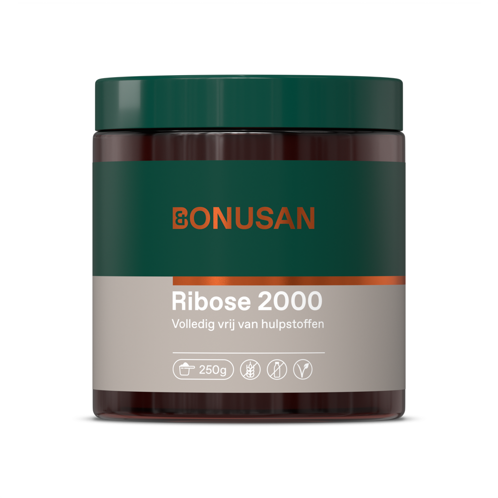 Bonusan Ribose heeft van nature een aangename zoete smaak. Bovendien is het goed oplosbaar in water en (sport)dranken. Ideaal om te combineren met bijvoorbeeld onze Magnesan Forte Plus poeder of Creatine Monohydraat poeder. De ribose is makkelijk te doseren dankzij de poedervorm en de meegeleverde maatlepel. Hoge kwaliteit dankzij zuivere en kwalitatieve D-ribose Veiligheid staat bij Bonusan voorop bij alles wat we doen: van de zoektocht naar goede grondstoffen, het bepalen van de juiste samenstelling en het produceren van onze supplementen, tot aan het bewaren en verwerken hiervan. In elk van die facetten hebben wij kwaliteitscontroles ingebouwd. Niets verlaat onze fabriek voordat ons eigen laboratorium het heeft goedgekeurd. Daarnaast bevat Bonusan Ribose alleen puur ribosepoeder zonder toegevoegde hulp- en smaakstoffen. Geschikt om tijdelijk het gehalte ribose in het lichaam aan te vullenBonusan Ribose bevat D-ribose in een zuivere en kwalitatieve poedervorm. Dit kan een aanvulling zijn wanneer er behoefte is aan extra D-ribose in ons lichaam. Voor (sportieve) inspanning en bij therapeutisch gebruik worden vaak hogere doseringen van enkele grammen gebruikt. Voor onderhoud adviseren wij een dosering van 1maatschepje van 2 gram. Afhankelijk van de behoefte kan Bonusan Ribose overdag ingenomen worden, of vlak voor het slapen met water. Speciaal voor de professionele sporter produceert Bonusan ook Topsport Ribose, dit ribosepoeder is door de NZVT getest en gegarandeerd dopingvrij.GebruikDagelijks 1 tot 5 afgestreken maatlepels oplossen in water en opdrinken, bijvoorbeeld voorafgaand aan een training of een andere inspannende bezigheid of voor het slapen gaan. Een afgestreken maatlepel bevat circa 2 gram poeder. Een maatlepel is bijgesloten.SamenstellingSamenstelling per afgestreken maatlepel á 2 gramInhoud%RI*D-Ribose2 gr* Referentie-Inname IngrediëntenD-RiboseGegarandeerd vrij van