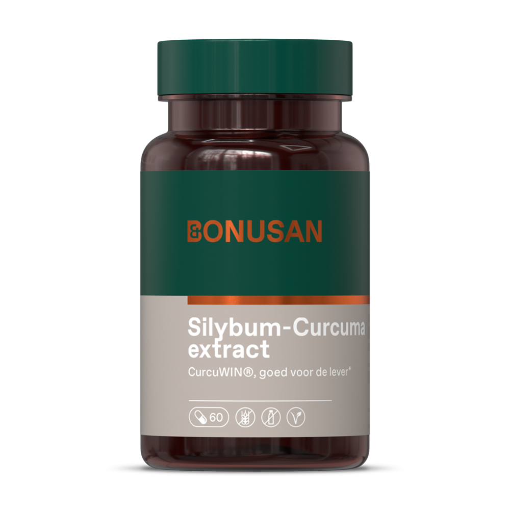 Bonusan Silybum-Curcuma extract is een sterk combinatieproduct dat bijdraagt aan de instandhouding van de normale leverfunctie*. Dankzij het gepatenteerde Curcuma longa extract is dit product zeer goed opneembaar. Waarom silybum en curcuma?Mariadistel (Silybum marianum) wordt ook wel wilde artisjok of leverkruid genoemd. Uit de vruchtwand van de zaden wordt de stof silymarine gewonnen. Silybum marianum ondersteunt het immuunsysteem* en draagt bij tot de normale werking van het hart*, instandhouding van de normale leverfunctie* en de bescherming van cellen tegen oxidatieve schade*. Curcuma wordt gewonnen uit de wortelstok van de plant Curcuma longa. Deze plant, ook wel bekend als de geelwortel, is lid van de gemberfamilie (Zingiberaceae). Curcuma wordt verkregen door de wortelstok te vermalen en is ook de stof die kerrie zijn geeloranje kleur geeft. Curcuminoïden, de actieve stoffen van curcuma, hebben een zeer groot toepassingsgebied en kennen zowel een preventieve als therapeutische waarde. Curcuma ondersteunt het immuunsysteem* en de gewrichten* en draagt, net als de mariadistel, bij tot de instandhouding van een normale leverfunctie*.De voordelen van Bonusan Silybum-Curcuma capsulesBonusan Silybum-Curcuma is een combinatieproduct van de kruiden Silybum marianum en Curcuma longa. De werkzame stoffen zijn curcuminoiden (curcuma) en silymarine (mariadistel). Silymarine is een complexe mix van polyfenolen. Bewerkte silymarineproducten hebben een minder complexe samenstelling dan het natuurlijke Silybum marianum extract. Door natuurlijke plantenextracten te gebruiken blijven we •Goed voor de lever* dankzij unieke combinatie van mariadistel en curcuma •Verbeterd opneembaar dankzij CurcuWIN™ •Gestandaardiseerde extracten met 80% silymarine en 20% curcuminoïdenSilybum-Curcuma extract