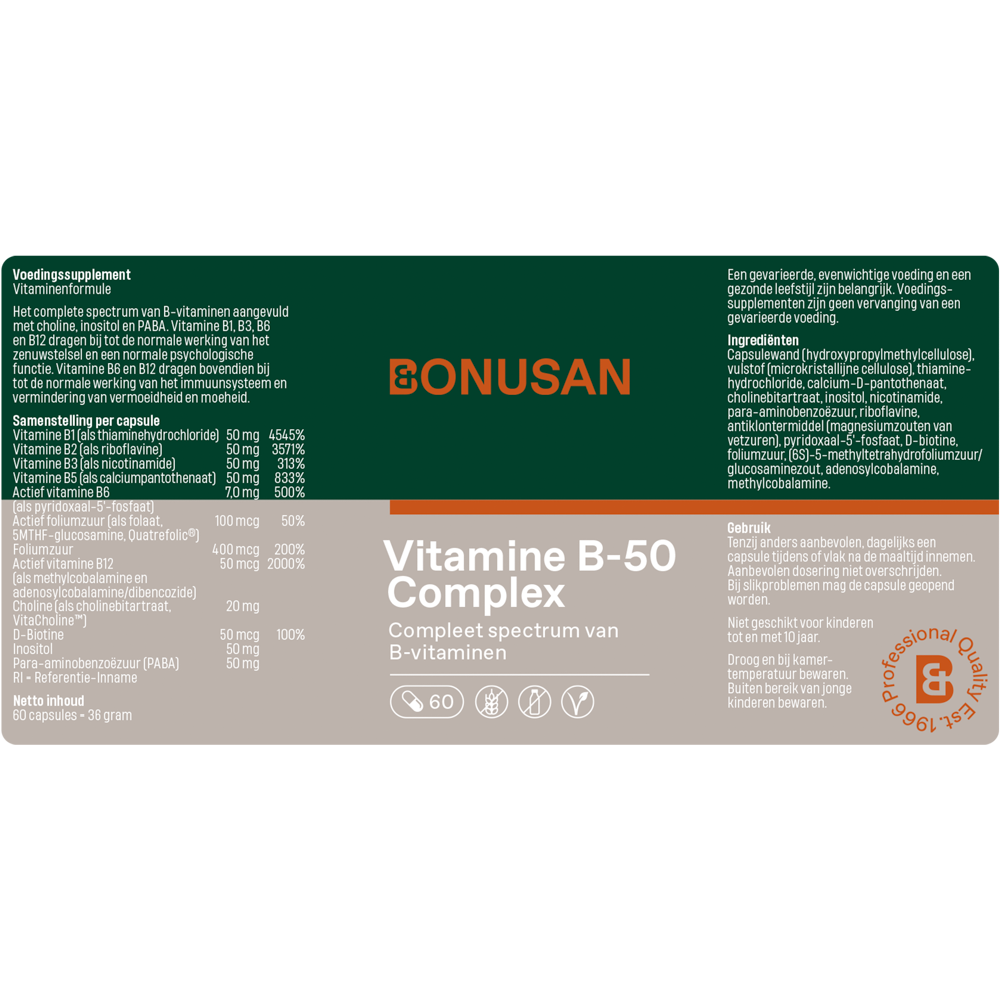 Vitamine B-50 complex bevat het complete spectrum van B-vitaminen. Daarnaast bevat het inositol, PABA en choline. Vitamine B-50 complex bevat het complete spectrum van B-vitaminen. Daarnaast bevat het inositol, PABA en choline. De B-vitamines werken samen en zijn voor hun individuele taken van elkaar afhankelijk. B1, B3, B8, B11 en B12 zijn bijvoorbeeld gunstig voor een goede geestelijke balans. Daarnaast zijn deze B-vitaminen goed voor de gemoedstoestand, het concentratievermogen, geheugen en leervermogen. Vitaminen B6 en B12 zorgen mede voor een goede weerstand en ondersteunen het energieniveau. Ze helpen bij vermoeidheid en dragen bij aan het behoud van een normaal zenuwstelsel. Tot slot ondersteunt biotine (B8) de normale huid, haargroei en is het goed voor de slijmvliezen.GebruikDagelijks 1 capsule tijdens of vlak na de maaltijd innemen. Bij slikproblemen mag de capsule geopend worden. B-vitaminen hebben een onplezierige en sterke geur. Ze kunnen misselijkheid veroorzaken als ze op een lege maag worden ingenomen. Dit wordt (grotendeels) verholpen door de B-vitaminen tijdens de maaltijd in te nemen. Daarnaast kan de urine helder- tot donkergeel kleuren na gebruik van Vitamine B-50 Complex. Dit is een onschuldig verschijnsel en is het gevolg van het uitscheiden van een eventuele overmaat aan riboflavine.Samenstelling•Alle B-vitaminen in significante hoeveelheden•Bevat ook ondersteunende choline, inositol en PABAVitamine B-50 Complex